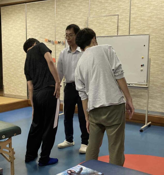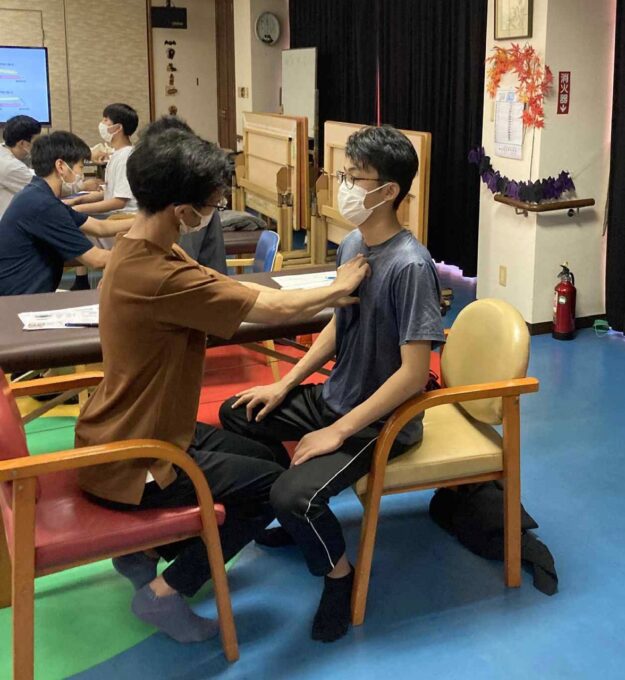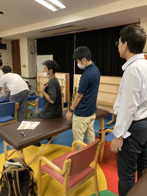 休憩を挟んで、自動運動検査後に、椎骨(椎間関節)に問題があるのか、あるいは肋骨に問題があるのかという鑑別方法を示し、各々で確認してもらう。