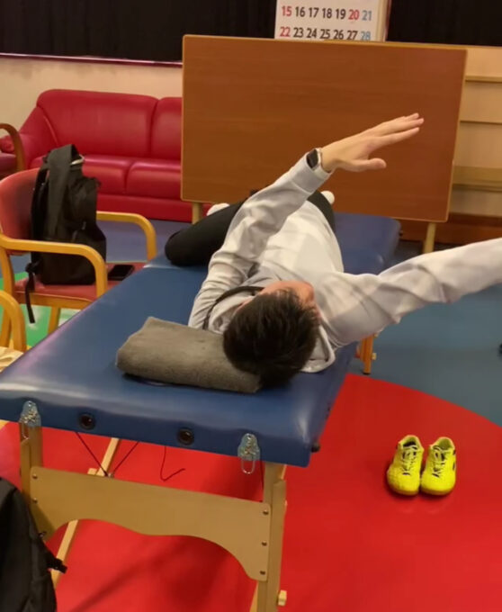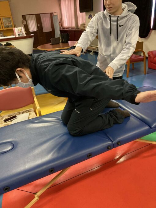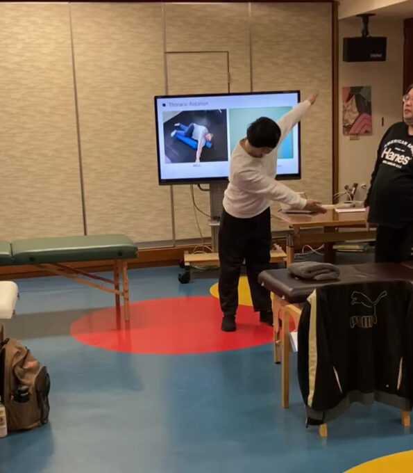 胸郭の捻れや偏位に対する筋の促通のためのトレーニングを実際に行って、変化を感じてもらいました。